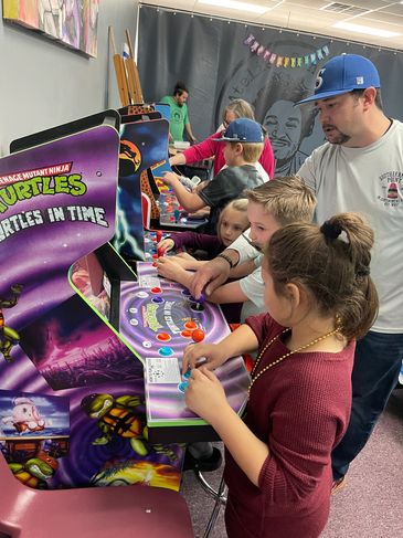 Elevate your paint parties with an array of extras! Dive into the fun with arcade games, Nintendo's Just Dance, and Mario Kart featured on a projector. Our generous space ensures there's plenty of room for cake and gifts.